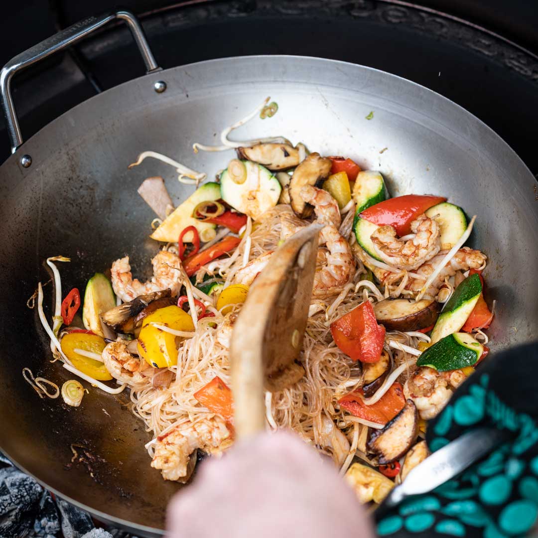 The Carbon Steel Wok is a versatile addition to your outdoor cooking arsenal. This 17-inch (43 cm) wok delivers rapid, even heating for authentic stir-fries, searing, and more. Dual handles ensure confident maneuvering, while the sloped sides facilitate effortless tossing and keep ingredients centered over intense heat. Seamlessly integrating with the EGGspander system, it expands your outdoor cooking repertoire.