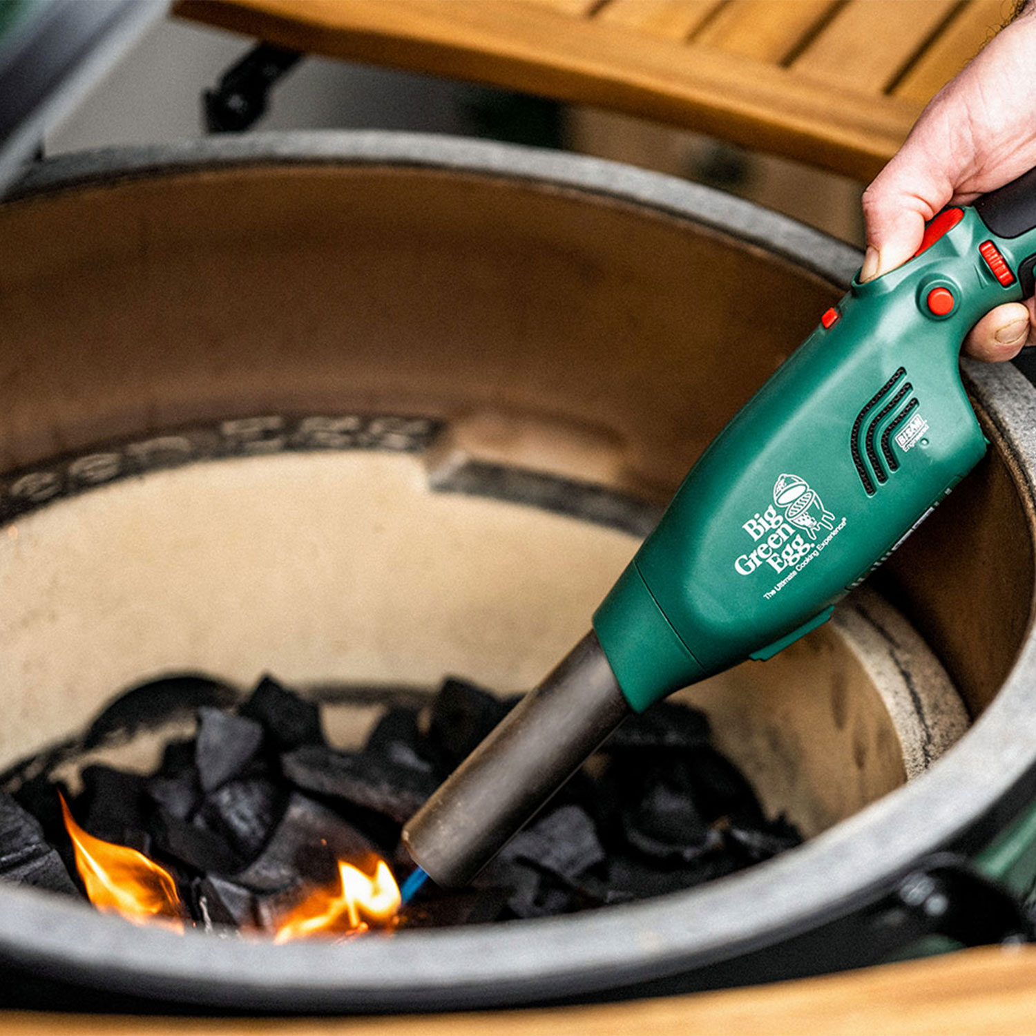 The Electric EGGniter is a tool designed for easy ignition of lump charcoal or hardwood. This innovative tool harnesses super-heated air to light lump charcoal or hardwood in minutes, eliminating the need for matches or lighter fluid. Its robust aluminum heat shield and three-setting power system (Off/Fan/Hot) ensure precise control and safety. The automatic OFF switch and 6-foot (1.8 m) power cord add convenience to your outdoor cooking ritual.