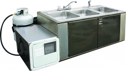 This 3-bowl self-contained sink is made to mount onto a trailer. We can add it onto many of our existing trailer models or include it in the design of new units. Designed for on-site clean-up. Holds 11 gallons of fresh water and 15 gallons of grey water.